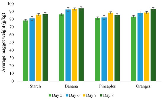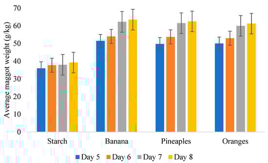 The weight of the maggots is expressed in grams per kilogram of the dry substrate. The number of days had a substantial effect on the average weight of the maggots, as seen in Figure 4. However, the extent to which the number of days affected the maggot weight differed depending on the type of substrate used. In this study, a gradual effect was observed from starch materials, with a more significant effect observed from banana and pineapple materials, especially during the 7th and 8th day of the trial. On average, the highest average weight of 63.5 g/kg was achieved from the banana materials followed by 62.5 g/kg from pineapple materials during the 8th day of the trial. However, the lowest maggot weight of 36 g/kg can be observed from the 5th day of the trial under starch materials without fly attractant. In the literature, general feeding conditions, including the type of substrate material, have also been observed to be among the crucial decisive factors for maggot production as it affects nutrition during the larvae development phase [40].