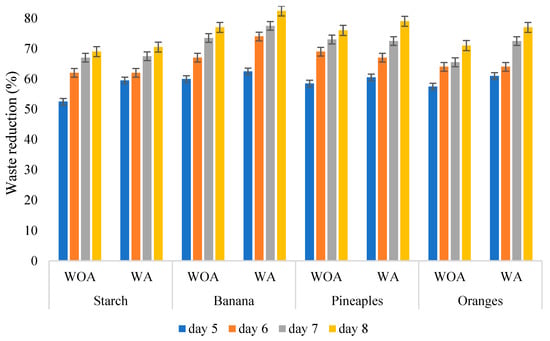 In general, the relative dry weight reduction in the trials varied from 52.5% to 82.4% (Figure 6). As previously observed, the application of fly attractant increased the number of maggots that affected the weight after harvesting; the amount of the remaining waste after harvesting was also observed to correspond to the number of maggots in a breeding vat. Breeding vats with more maggots ended up with a little amount of waste remaining. In this study, the highest waste reduction was achieved from the combination of 8 days and banana waste materials with a waste reduction efficiency of 82.4%. In the literature, maggots have also been observed to be highly efficient in organic waste reduction [46].