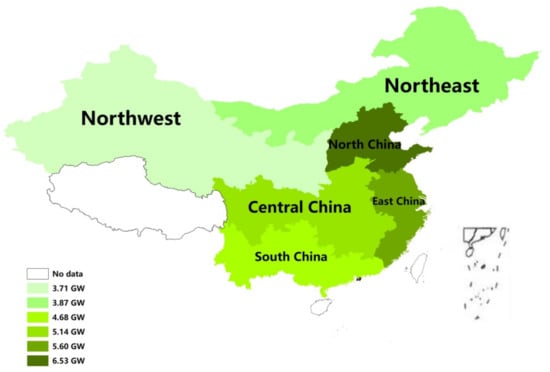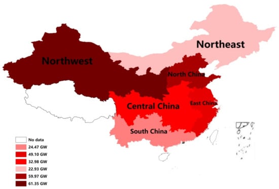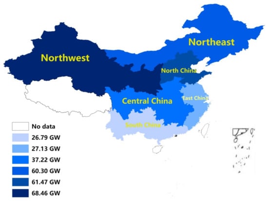 China has divided the power industry into six power grids according to geography, resource endowment, and transmission line structure: Northeast, North China, Northwest, East China, Central China, and South China. As the main body responsible for implementing RPS, power grid enterprises are also the principal means to ensure the full acquisition of renewable energy. Therefore, this paper takes the six regional power grids as the research object to explore the dynamic distribution scheme of renewable energy power quota indicators. The installed power generation capacity of wind, solar, and biomass energy in the six regions in 2020 is shown on maps of current renewable energy (Figure 1, Figure 2 and Figure 3).