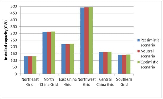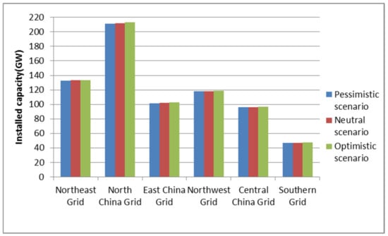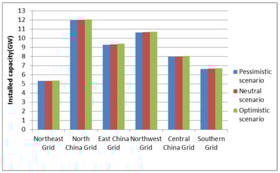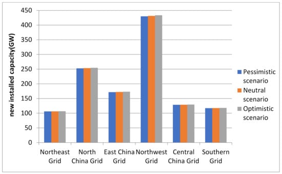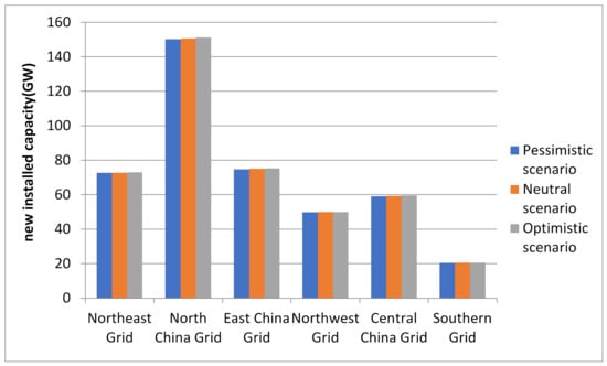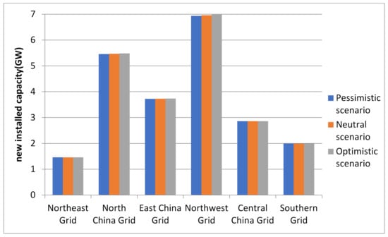 This study considered three scenarios of the pandemic’s impact on the economy: optimistic, neutral, and pessimistic. The newly installed capacity results of power generation such as wind, solar, and biomass energy under the three scenarios are shown in Figure 10, Figure 11 and Figure 12. By comparing the new capacity of non-hydropower RE generation of all grids under various scenarios, the following conclusions can be drawn: