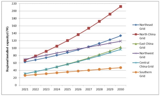 China has a vast territory, and the resource endowments of various regions are different, resulting in different available RE consumption of each power grid and an upper limit for the development of non-fossil energy. The maximum potential of the installed capacity of each power grid is shown in Equation (6).