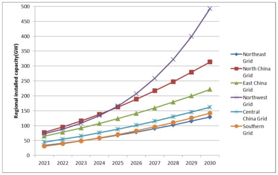 In this paper, 2020 was selected as the base year for the research period 2021–2030, and the discount rate was set to 10%. Since China’s water conservancy and power generation is very mature, annual power generation is relatively stable. In addition, the cycle of site selection and construction of nuclear power in the early stage is very long; the operational cost of a nuclear power plant is large; the regional distribution of nuclear power generation is uneven; and the change in power generation is small. The generation of other non-hydropower energy such as geothermal and tidal is relatively small, so it is not included in the calculation. Therefore, this paper does not consider hydropower and nuclear power generation technology but mainly research into the optimal allocation of installed non-hydropower capacity, including renewable energy such as wind, solar, and biomass.