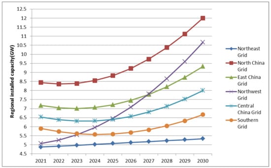 From the numerical results of cumulative installed capacity in Figure 4, Figure 5 and Figure 6, it can be seen that, by the end of 2030, the maximum installed capacity of non-hydropower RE power generation in China will be about 1667.39 GW, and the minimum will be about 1655.54. Among these, the North China Power Grid has the largest newly installed wind power generation capacity, while the Northwest Power Grid has the largest newly installed solar and biomass power generation capacity.