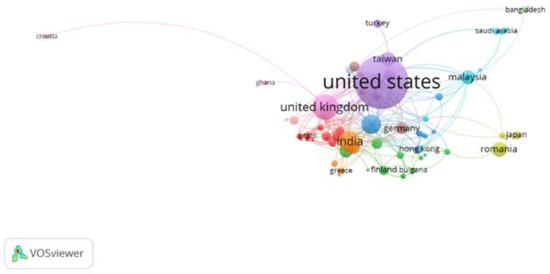 The cluster of countries United States of America, United Kingdom, and India are in evidence. This is because these countries have the most published papers (563 papers), representing 52.27% of the total papers selected for research. In Figure 3, the lines indicate coauthorship between countries, and the distance between clusters indicates how much these countries publish in co-authorship.