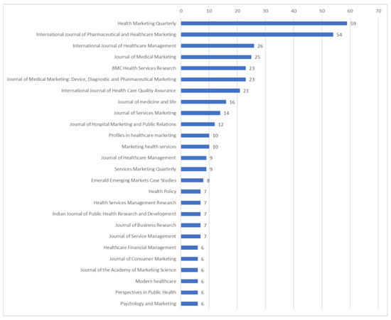 Most of the journals (67.67%) contain only one paper related to the researched topic. This indicates that these journals are not from the healthcare marketing area but, in the context of the main topic of the journal, they also included papers that addressed topics in the healthcare marketing category. In Figure 4 we presented the journals that published more than 5 papers (5.19%) related to the researched topic. According to the selection made in our study, the journal with the most papers published in the healthcare marketing area is Health Marketing Quarterly (59 papers), followed closely by the journal International Journal of Pharmaceutical and Healthcare Marketing (54 papers).