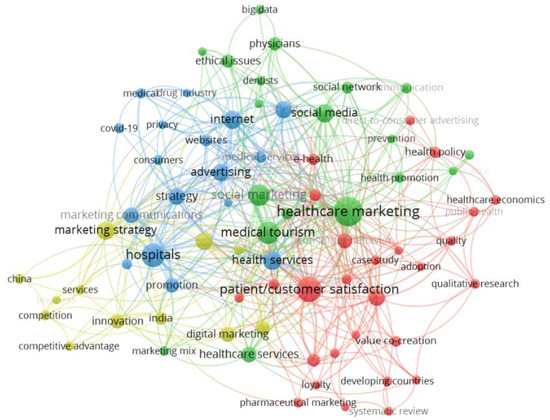 As the study also aimed at identifying general topics addressed in the articles, we used a thesaurus file for merging keywords with similar meanings. Subsequently, the grouping of the keywords by cluster analysis generated the map shown in Figure 5. As a result, a total of four clusters was generated, centered around the following keywords: cluster one with the main keyword “patient/customer satisfaction”, cluster two main keywords “healthcare marketing”, “medical tourism” and “social marketing”, cluster three main keywords “hospitals” and “health services”, and cluster four main keyword “marketing strategy”.