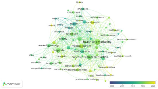 Another useful analysis for the objectives of the study in terms of keywords is the one that shows the evolution over time of the appearance of the keywords in the papers included in the sample. Figure 6 indicates that the papers in recent years have addressed topics that have referred to the terms “COVID-19”, “value co-creation”, “social media” or “big data”. Papers on medical tourism are also relatively recent papers. The term “medical tourism” appears in a significant number of papers included in the sample. This is a topic of interest to authors who focus on healthcare marketing in their papers.