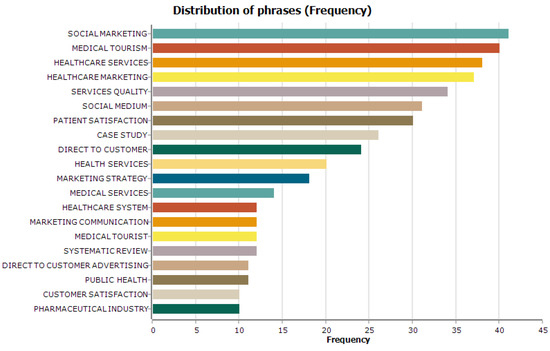 The analysis of the keywords indicated by the authors was completed with the analysis of the titles of the selected papers in the database (Figure 7). The WordStat (Provalis Research) [96] application was used for this analysis. The analysis of the titles of the papers in the database shows that the most common phrases in the titles are “social marketing” (41 appearances) and “medical tourism” (40 appearances), followed by “healthcare services” and “healthcare marketing” with 38 and 37 appearances, respectively. “Patient satisfaction” appears in the title of 30 of the analyzed papers, and “customer satisfaction” in 10.