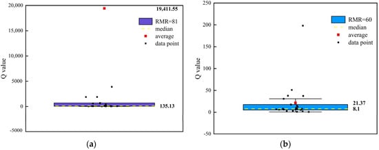 The data in Table 6 are analyzed and the boxplot [28] is drawn, and the results are shown in Figure 1; it can be seen from the figure that the corresponding median Q value is 135.13 when RMR = 81, 8.1 when RMR = 60, and 0.63 when RMR = 41. When RMR = 20, the median value of Q was 0.02. Except for RMR = 81, the median is close to the average in other data, and the gap between them is slightly larger when RMR = 60; however, when RMR = 81, the Q value obtained by some methods is more than 350,000, and there are many abnormal points in the data, due to some correlations can provide anomalous values because they are intended for specific lithotypes, and therefore, outside from their range of application they are useless. Therefore, the median was selected for analysis of this content.