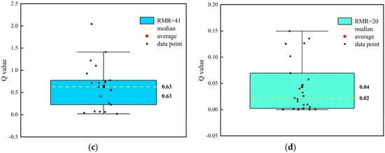 RMR classification and Q classification corresponding to the results of the boxplot. Where: (a) is the boxplot when RMR = 81, at the same time, a partial magnification of the Y-axis is performed for ease of observation; (b) is the boxplot when RMR = 60; (c) is the boxplot when RMR = 41; (d) is the boxplot when RMR = 20.