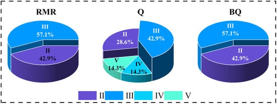 The classification results of each method are shown in Figure 3, in which the proportion of Grade III surrounding rocks exceeds 40% in all types of methods, classification IV and V surrounding rocks only appear in Q classification, and Grade II surrounding rocks account for more than 40% in RMR and BQ classification. From the overall classification results, RMR and BQ classification results are generally more adventurous, while the influence of RQD values in Q classification is too great, leading to large variability in classification results.
