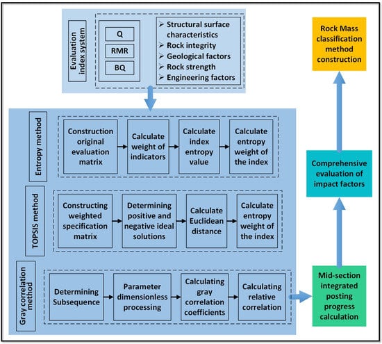 More and more scholars apply scientific theories and methods to various aspects of mine [29,30,31], which plays an important role in promoting the development of mining engineering field. Choosing appropriate scientific theories and methods to be applied to rock mass classification can help people better describe the rock mass grade. The entropy weight [32] is an objective assignment method that calculates the degree of variation in indicator data and uses the quantity of information offered by each indicator’s entropy value to establish indicator weights. Gray correlation method is derived from gray system theory in system science theory [33], which can avoid the situation where the quantitative results do not match the qualitative analysis. TOPSIS method [34] is a common decision technique for multi-objective decision analysis of limited solutions in systems engineering, and is now also often used in the comprehensive evaluation of multiple indicators. In this paper, the three approaches are combined to provide a full evaluation of rock mass classification, and a new method of rock mass classification is attempted to be built on this premise. Figure 4 depicts the exact procedure.