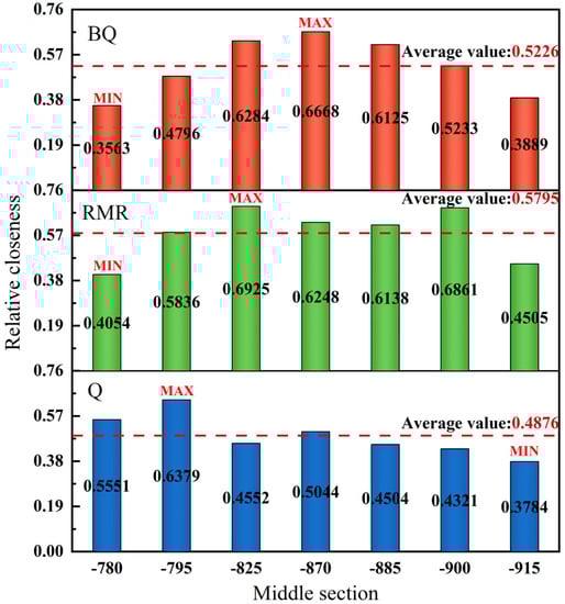 TOPSIS method and grey correlation analysis were used to analyze the relative closeness of the grading results of each section. The results were shown in Table 11, and the relative proximity degree was shown in Figure 5; it can be seen from the table that the relative proximity degree of each method is between 0.35 and 0.70. In Q classification, the middle segment of 795 has the best effect, while the middle segment of 915 has the worst. In the RMR classification, the middle segment of 825 had the best effect, and the middle segment of 780 had the worst effect. In BQ classification, 870 middle segment had the best effect, and 780 middle segment had the worst effect. In general, the average value of RMR was the highest and the overall grading effect was the best. Due to different considerations and the interference of subjective factors, different classification methods show great differences in the relative closeness between different sections. When different methods are used to classify the same area, normally different rock mass grades will be obtained, therefore, at least the employment of at least two rock classification methods is recommended.