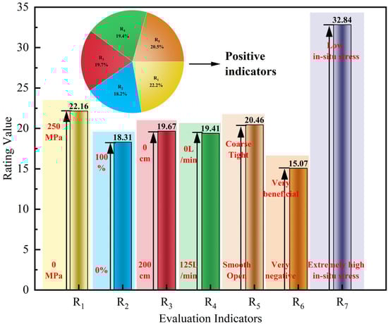 The processing steps are the same as above, and the results of the entropy weighting method analysis of each influencing factor are obtained, as shown in Table 14, where R7 has the largest entropy weight and R6 the smallest. The information carried by the geo stress damage index is the most effective.