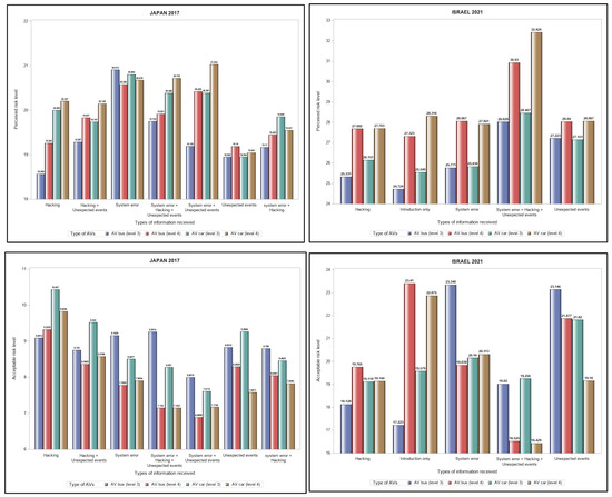 Furthermore, individual heterogeneity was controlled by conducting a type III ANOVA for a linear mixed model. Table 8 shows ANOVA results for dread and unfamiliarity risks based on the three types of AV risk information. In Japan 2017 surveys, there were statistically significant differences in dread risk for participants who received information related to system errors for AV-bus level 3 (MEAN = 9.44, F(3, 1438) = 3.33, p = 0.0188) and level 4 (MEAN = 5.89, F(3, 1438) = 2.14, p = 0.0930) and AV car level 3 (MEAN = 16.37, F(3, 1438) = 5.70, p = 0.0007), and there were statistically significant differences in unfamiliarity risk for participants who received information related to system errors for AV-bus level 3 (MEAN = 5.68, F(3, 1438) = 2.33, p = 0.0722) and AV car level 3 (MEAN = 10.92, F(3, 1438) = 3.81, p = 0.0098); but there were no significant differences in both dread risk and unfamiliarity risk for participants who received information related to hacking and unexpected events for all the AV technologies. In Israel 2021 data, there were statistically significant differences in both dread and unfamiliarity risk for participants who received information related to system errors for AV-car level 3 only (MEAN = 4.89, F(3, 1438) = 2.28, p = 0.0786; MEAN = 2.16, F(3, 1438) = 3.68, p = 0.0119); but there was no significant difference in both dread risk and unfamiliarity risk for participants who received information related to hacking and unexpected events for all the AV technologies. The results were consistent with the findings above that AV risk information did not significantly affect perceived and acceptable risk levels.