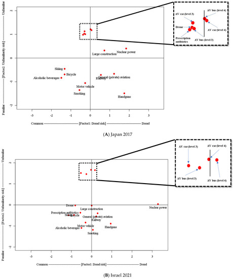 After viewing the embedded video, respondents self-reported perceived risks and benefits associated with 20 activities and technologies in the Japan 2017 data and 16 activities and technologies in the Israel 2021 data. To compare the perceived risk and factors between the two data sets, the 16 activities and technologies in common were retained in the analysis: nuclear power, motor vehicles, handguns, smoking, alcoholic beverages, general/private aviation, large construction, bicycling, skiing, railways, drones, prescription antibiotics, AV-bus (level 3), AV-bus (level 4), AV-car (level 3), and AV-car (level 4). Four extra activities and technologies in the Japan 2017 data were not included in the analysis: mountain climbing, energy drinks, electric power (non-nuclear), and amusement attractions.
