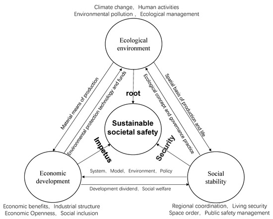 The core goal of sustainable development research is to reveal the short-term and long-term coordinated operation state of the natural–social complex system from the regional scale to the global scale and then provide a decision-making basis for spatial governance at different scales [7]. Relevant research trends show that, on the one hand, the theoretical connotation of sustainable development has been continuously enriched and improved [8], and a knowledge system of sustainable development [9], sustainable society [10], scientific development concept [11], (marine) ecological civilization construction [12], double-carbon target development [13], green coordinated development [14], and regional high-quality development [15] has been initially formed. These studies jointly call for the future society to be a social form in which the humanistic environment and the EE are coupled and coordinated and constantly try to expand it at the level of social life and environmental protection, trying to show people a picture of a sustainable society with economic prosperity, livable environment, and SS [16,17]. On the other hand, the construction of index system and the evaluation of comprehensive index are increasingly regarded as an effective method for the evaluation of sustainable development, as well as an effective tool for policy making and academic exchange [18]. Human development needs to constantly obtain various services from the ecosystem; so, the real sustainable development is based on the EE, realizing the comprehensive evolution of social progress and ED, so as to realize the high-quality development of human society [19]. Under the guidance of this idea, the sustainable society index, which integrates sustainable development and social progress, is considered by many scholars to be able to comprehensively and comprehensively evaluate the sustainable development of a region [20,21,22,23]. In addition, some recent efforts to evaluate the level of sustainable development based on the perspective of green and low-carbon development are also worthy of recognition [14]. No matter the previous theoretical exploration of the connotation of sustainable development, the later quantitative evaluation of the sustainable social index, or even the recent call for a green and low-carbon society, they all pay attention to the social problems in sustainable development in different degrees and with different emphases; for example, the connotation of sustainable development emphasizes the behavioral constraints of social development, the evaluation of sustainable society focuses on the sharing and promotion of social well-being, and the idea of green and low carbon focuses more on the improvement of social quality in the times. However, few studies pay attention to the societal safety issues in sustainable development.