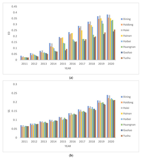 Through the time-space comparative analysis of the evaluation results of ED, SS, and EE, we can find out the power source for the promotion of SSS level in various regions and the main contradiction points of system coupling and coordination. The evaluation results show that, in the past 10 years, the ED, SS, and EE index of Qinghai has been on the rise; the fluctuation range is relatively small, but the spatial development level is different, and the regional growth rate is different.
