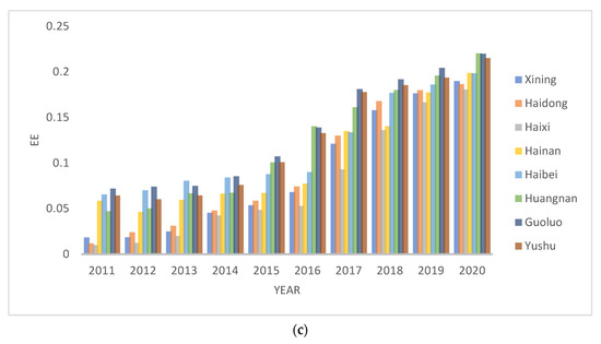 Qinghai’s EE had been constantly improving, with the horizontal average rising from 0.0435 to 0.1075, an increase of 1.47 times. The spatial pattern was relatively stable; the low-value areas were mainly distributed in Xining (0.0875), Haidong (0.0913) and Haixi (0.0763), and these areas are areas with a relatively high level of urbanization in Qinghai, as well as important industrial towns, with a relatively large amount of waste water, smoke (powder) dust, and solid waste. At the same time, the forest coverage rate and NDVI index in Haixi were far lower than those in other areas, further lowering the score. Hainan (0.1256) and Haibei (0.1299), which are non-industrial areas adjacent to Xining and Haidong, have EE indexes in the middle of the province, and their environmental improvement is slower than that of other areas. The EE indexes of Huangnan (0.1230), Guoluo (0.1350), and Yushu (0.1271) were kept at a high level. Guoluo has benefited from the high NDVI index and has a good EE foundation. In recent years, Huangnan has strengthened the EE management, and achieved remarkable results in urban greening and grassland ecological restoration. Yushu has less industrial pollution, and its ambient air quality has always maintained a high level (Figure 3c).