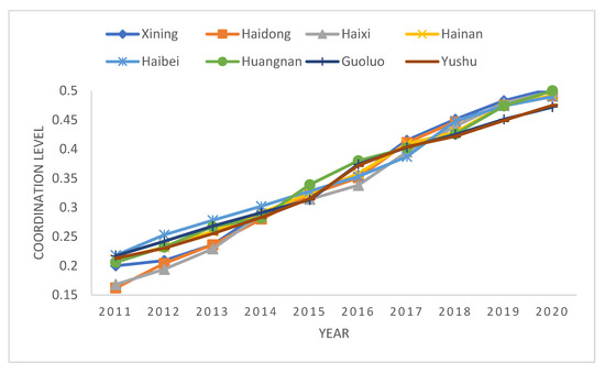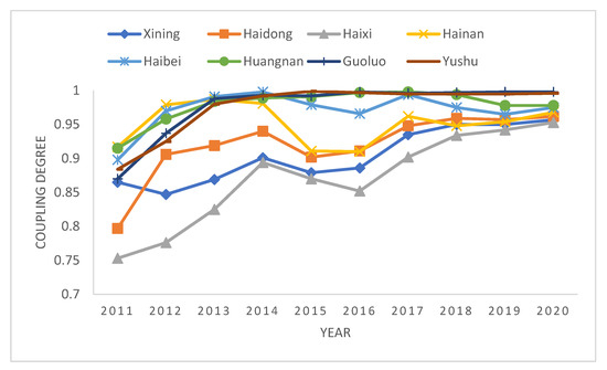 We used Formula (7) to calculate the coupling degree of the ED, SS, and EE systems in Qinghai from 2011 to 2020 (Figure 4). In the past 10 years, the coupling degree of eight prefectures (cities) has been fluctuating and rising, and the overall level was high. The average coupling degree increased from 0.8624 in 2011 to 0.9734 in 2020, and the average value was 0.9435, which indicated that the ED, SS, and EE systems in Qinghai were closely related and influenced each other. Among them were from 0.8624 to 0.9610 in 2011–2014, from 0.9610 to 0.9396 in 2014–2016, and from 0.9396 to 0.9734 again in 2016–2020. Except that the coupling degrees of Haidong and Haixi in 2011 were 0.7970 and 0.7530, and that of Haixi in 2012 was 0.7760, the other regions were all above 0.8. As far as the region is concerned, Haixi had the lowest value of 0.8701, Huangnan had the highest value of 0.9782, and other regions were between 0.9039 (Xining) and 0.9767 (Guoluo). From the perspective of regional growth, the biggest increase was in Haixi, from 0.753 in 2011 to 0.953 in 2020. The smallest increase was in Hainan, from 0.917 in 2011 to 0.968 in 2020.