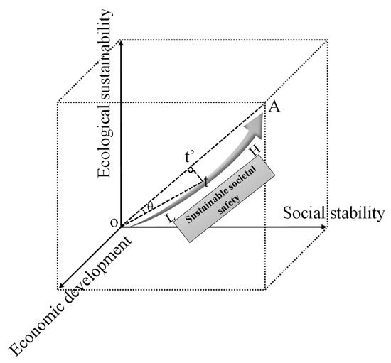 The emergence of societal safety problems is the result of a combination of many factors over a long period of time. Based on the coupling and coordination level of sustainable social structure system to reflect the level of societal safety, this can break through the defect that traditional societal safety research only pays attention to the current situation of safety and neglects or even ignores the sustainability of societal safety. At the same time, it also effectively avoids the disadvantages of the previous evaluation methods affected by personal subjective factors. A truly safe society should be one with coordinated structural development, and we should not only pay attention to the negative influence of a certain system element. As shown in Figure 6, SSS system consists of EE, SS, and ED systems. O(0,0,0) stands for the zero point of SSS, A(1,1,1) stands for the ideal goal of SSS, and vector OA is a coupled and coordinated path of SSS, which requires the coordinated development of ED, SS, and EE. No matter which element in the system does not evolve together with the other two elements, social development will eventually deviate from the ideal track, which may lead to some social problems more or less, and even a series of societal safety effects in serious cases. That is to say, the SSS level of a region in T year is not the module length of the vector Ot directly obtained by weighted summation, and it should be the module length of the mapping vector Ot’ of the real horizontal vector OT of system development on the coupling coordination path vector OA [14].