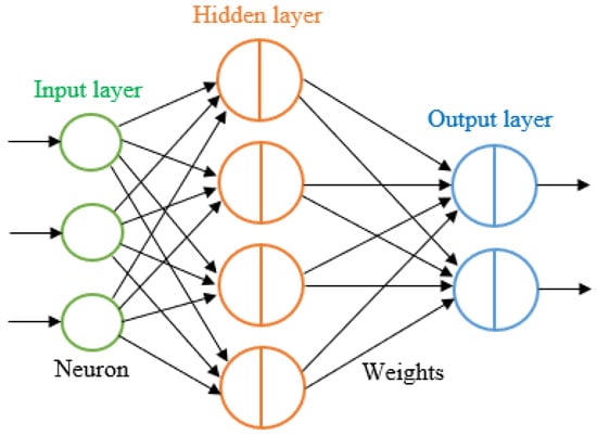 The artificial neural network (ANN, for simplicity often abbreviated as NN only) is made up of an input layer of neurons, one or two hidden layers of neurons (or even three), and a final layer of output neurons. A typical architecture is depicted in Figure 1, which also includes lines connecting neurons. Weight is a numerical value assigned to each connection. In the hidden layer, the output of neuron i is .