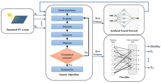 In Figure 4, the ANN-based GA reduces the redundancy within the input data and provides more relevance between input/output data. Then, in the evaluate step, we calculate the input feature subsets by applying the ANN, which maximizes the mutual data between features. Finally, the crossover and mutation steps are used to detect the best features by minimizing the redundancy-based evaluate step. The GA selects the subset of features sent to the ANN for computing the fitness value. At the final stage, the GA identifies an optimal subset of the feature. Next, to validate the robustness of the GA, the best features are fed to another proposed classifier, such as LSTM [24,25], CNN [26,27], FFNN [28,29], CFNN [30,31], or RNN [32,33]. The proposed technique (as well as other known methods for fault diagnosis in PV arrays) is presented in Figure 4 as a flow chart.