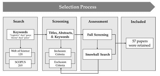 To answer the research questions, we conducted a comprehensive review of scientific papers in the field of logistics pricing. Clear article selection criteria minimize the inclusion and exclusion bias of researchers and increase the heterogeneity of the data [18,19]. Therefore, we designed a literature search protocol and determined the inclusion and exclusion criteria. The literature was mainly drawn from the Web of Science and SCOPUS databases, which are leading and extensive citation databases that cover most of the logistics pricing literature [20]. We used the keywords “logistics”, “game theory”, and “price” to conduct a subject search in the database and identified 397 papers. The papers were evaluated and selected in a two-step filtering process. First, we further reviewed the titles, abstracts, and keywords of the papers based on the inclusion and exclusion criteria, and a total of 121 papers were considered relevant to the topic. Second, we performed a full-text reading and then conducted a snowball search of their references, adopting the same inclusion and exclusion criteria. Ultimately, 57 papers were retained for the review of this study. The literature selection process is shown in Figure 1, and all authors were involved in the joint assessment. The inclusion and exclusion criteria of the literature is shown in Table 1. In particular, according to the purpose of the literature review, we specified that logistics price should be the decision variable in the game model and be endogenous. After a full reading, much of the literature was excluded because it did not satisfy this criterion.