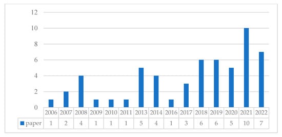A total of 57 papers were published in 47 journals from a variety of sources. In the observed sample, 9 journals have more than two papers, with Sustainability (Switzerland) ranking first with three papers. In terms of publication date, the first paper retrieved was published in the Journal of the Operational Research Society in 2006. Following that, intermittent peaks were observed. Four papers were published in 2008, with fewer studies published in the years that followed, and another peak in 2013. Overall, with 38 papers published after 2016, the number of papers published increased significantly. In 2021, there are 10 papers published, with 7 published this year (as of July). This supports the literature’s growing interest in logistics pricing. The source of article publication (TOP9) and the number of papers are shown in Figure 2 and Figure 3, respectively.
