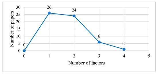 The frequency percentages of the influencing factors is shown in Figure 6. The most considered factor is the cost indicator, which accounts for 58%. In fact, all studies introduced cost indicators, except for one study that assumed zero platform-operating costs in its study for ease of analysis [78]. The next most important factor is service indicators. Scholars state that logistics service level affects pricing by influencing market demand or the cost of logistics services. Typically, studies use quadratic functions to represent the nonlinear relationship between service costs and service levels [24,29,30,43,62,64,73]. Service indicators currently appear in the group with a frequency of 20% and need more attention. In addition, some models considered sustainability indicators (10%), risk indicators (3%), competition indicators (4%), and other factors (6%). As can be seen, with the emphasis on the negative externalities of logistics activities, sustainability indicators have received more research attention. Appropriate logistics pricing strategies can push the sustainability of logistics activities. For in-depth study, bubble plots of the impact factors are drawn. Figure 7 shows the cross-frequency of the influencing factors. The bubble size indicates the number of times that the impact factors corresponding to the horizontal and vertical coordinates co-occur in the pricing models. It can be seen that 18 papers consider both cost and service indicators, accounting for 32% of the total literature reviewed. This indicates that the significance of service and cost indicators for logistics pricing is being acknowledged in an increasing number of studies. Moreover, the empty spaces might spark new ideas for future research. For example, we can investigate pricing decisions under the combined effect of service and sustainability metrics in the future. Figure 8 illustrates the number of factors included in the papers. Most of the literature considers the influence of only one or two types of factors when constructing pricing models. In the study of logistics service pricing, the more factors discussed, the fewer papers found. The results show that that it is quite difficult to model in this field.