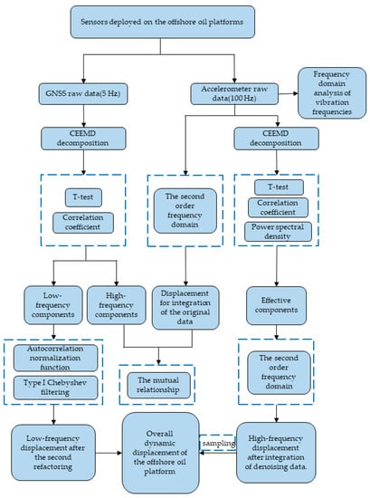 The monitored GNSS data and acceleration data were processed based on CEEMD–Chebyshev filtering in the following steps: (1) GNSS data were deconstructed using the CEEMD approach, which involved the extraction of low-frequency components from GNSS monitoring databases using a combination of the t-test and correlation coefficient; (2) Chebyshev filtering of IMF components, which accounted for a relatively high proportion of noise in low-frequency information, and summing with the unprocessed IMF components yielded the low-frequency dynamic displacement of the platform following second noise reduction. (3) We screened the acceleration data for useful information components based on t-test and power spectral density and integrated them into the frequency domain to obtain the high-frequency dynamic displacement of the platform. (4) Finally, the extracted GNSS low-frequency displacement was combined with the integrated high-frequency dynamic displacement to form the overall dynamic displacement of the platform through data sampling. Figure 1 depicts the flow chart for the overall displacement reconstruction in this paper.