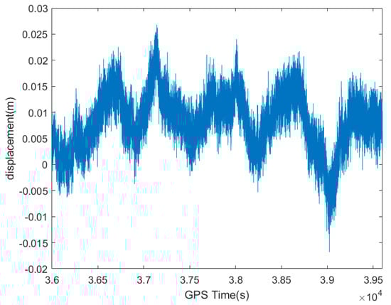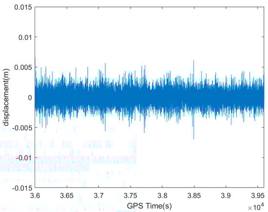 The accelerometer used in the experiment can provide high-precision nine-axis acceleration data, gyroscopic data, and magnetometer data in both vibration and non-uniform magnetic field environments. The collected data were first converted to coordinates using suitable mathematical methods; respectively, GNSS data were converted from an Earth-Centered, Earth-Fixed coordinate system to a station coordinate system, and acceleration data were converted from a carrier coordinate system to a station coordinate system. An hour (GPS time of 36,000–39,600 s) of simultaneous monitoring data in the north direction of the intercepted plane was processed and analyzed, and the GNSS and accelerometer raw data were as shown in Figure 2 and Figure 3.