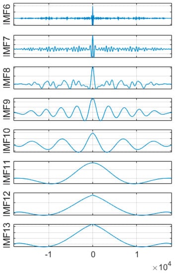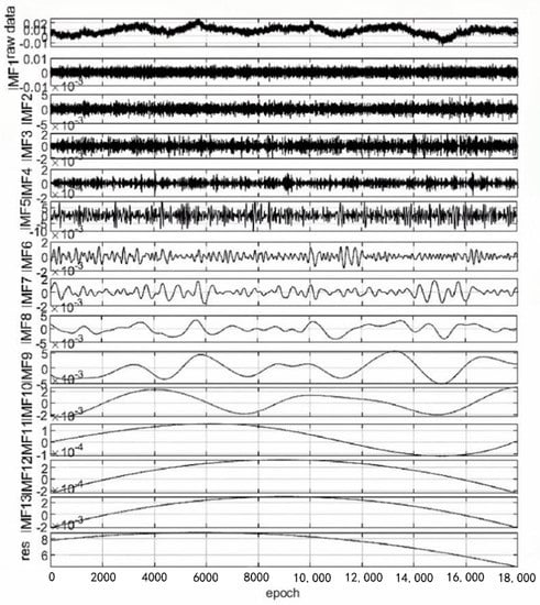 Firstly, the original GNSS data of the platform was deconstructed by CEEMD, which further decomposed the GNSS signal into IMF components distributed from high frequency to low frequency. Then the ratio of additional noise standard deviation to the original standard deviation was set as 0.2 and added to 100 groups of complementary and independent identically distributed white noise for averaging. The decomposition results are shown in Figure 4, from which it can be intuitively seen that the GNSS signal was deconstructed into different frequency (13 IMF components, and 1 trend term) residual components. Therefore, a particular technique was required to distinguish the noise component from the effective component.
