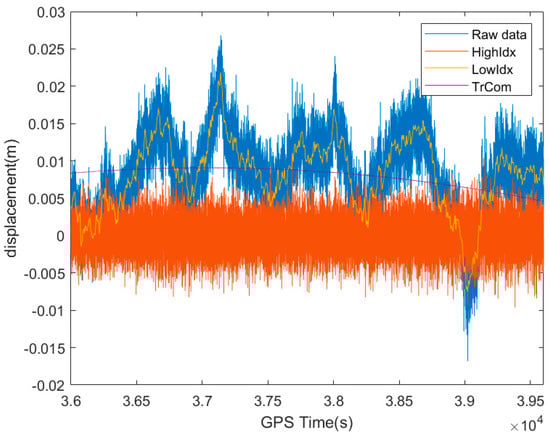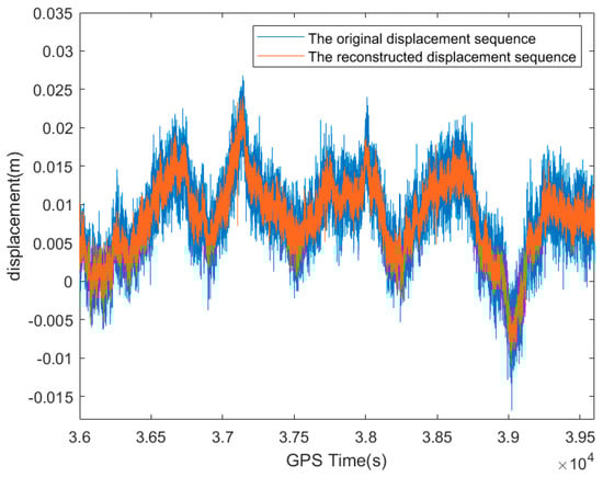 In the marine environment, owing to the effects of the stronger multipath than on land [16], the multipath error was more severe, there were several noise sources, and the true dynamic displacement of the platform was contaminated to some extent [29]. As shown in Figure 2, the GNSS short baseline solution results contained random noise and multi-path error effects, and the original maximum amplitude of the northward displacement of the platform obtained using GNSS was 26.79 mm. The noise-contaminated monitoring data required hybrid filtering for denoising processing in order to remove the noise that caused interference in the analysis and to extract the low-frequency components of the signal as much as possible. The procedure was as follows.