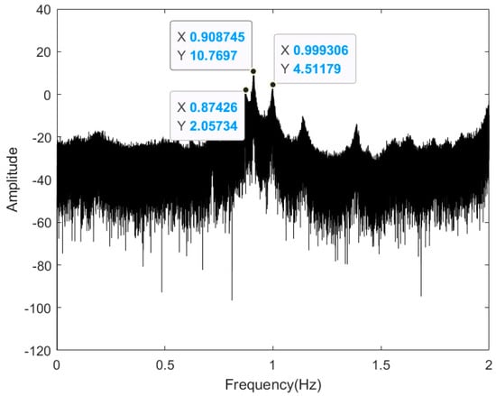 An accelerometer is commonly used for structural response monitoring under external loading conditions and has the advantage of high sampling rates and easy identification of high-frequency vibrations of the structure. However, it is not sensitive to the identification of low-frequency vibrations [33]. The acceleration data was intercepted for the same period of 1 h as GNSS monitoring data, to achieve the overall displacement refactoring. The acceleration monitoring signal was initially studied in the frequency domain using FFT to process the monitoring data, finding the vibration frequencies of the platform structure. To better extract the spectral characteristics of each frequency band, the monitoring data were detrended to remove the direct current component of the signal and the amplitude was calculated logarithmically to observe the periodic signal masked by the low amplitude noise. Figure 8 shows a plot of the power spectral density of the acceleration signal. It can be observed that the power spectral density plot identifies the first three order modal frequencies of the platform in the 0–2 Hz range, i.e., the three peaks corresponding to the plot: 0.8743, 0.9087, and 0.9993 Hz.