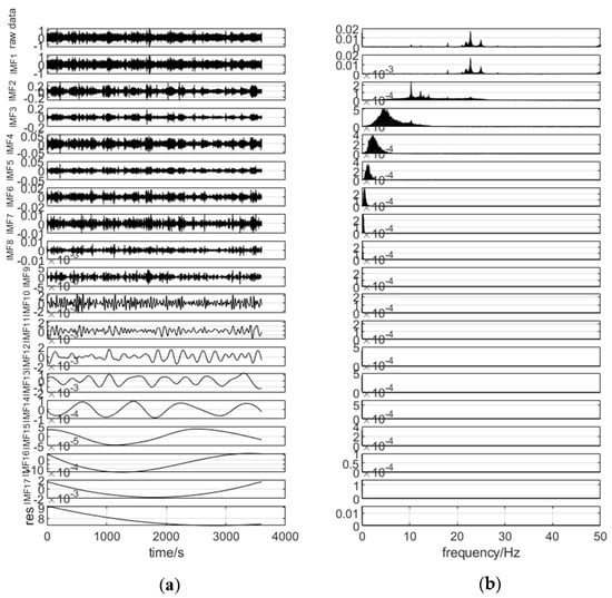 (a) CEEMD decomposition results of acceleration data and (b) the corresponding power spectral density functions for each order of IMF components.