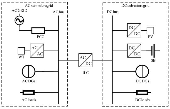 The grid structure of the AC–DC hybrid microgrid studied in this paper is shown in Figure 1, which mainly consists of distributed generations (DG), load, and a current converter. The AC bus is connected to a wind turbine (WT), diesel generator (DEG), microturbine (MT), and AC load, forming an AC sub-microgrid, which is also connected to the larger grid through the point of common coupling (PCC). The DC bus is connected to a photovoltaic cell (PV), fuel cell (FC), storage battery (SB), and the DC load, forming a DC sub-microgrid. The AC sub-microgrid and the DC sub-microgrid are connected via an interlinking converter (ILC) for bidirectional power flow.