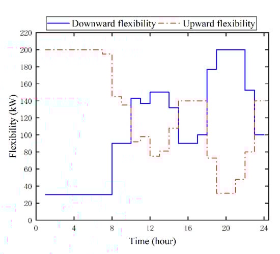 In addition to studying the economics of AC–DC hybrid microgrids, this paper also analyzes their flexibility. The upward and downward flexibility are used to characterize the flexibility of the microgrid system and to reflect the ability of the microgrid system to use the existing schedulable resources to respond to source–load uncertainty. The upward and downward flexibility are shown in Figure 6. The upward flexibility adjustment reaches the maximum value of 200kW in hours 1–7, whereas the downward flexibility adjustment reaches the maximum value in hours 19–21, and the remaining period has a sufficient margin.