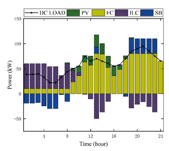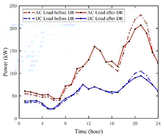 The results of the AC–DC hybrid microgrid operation using Strategy 1 are shown in Figure 7, Figure 8, Figure 9, Figure 10 and Figure 11. The composition of the AC/DC load before and after the demand response is shown in Figure 7, from which it can be seen that load in the peak and valley hours before and after the demand response has a more obvious change. The load curve is smoothed out and the effect of peak and valley reduction is achieved. Figure 12, Figure 13, Figure 14 and Figure 15 show the optimized operation results of the AC and DC sub-microgrids without considering the carbon trading mechanism and without considering the time-of-use electricity price, i.e., Strategy 2a and Strategy 3a.