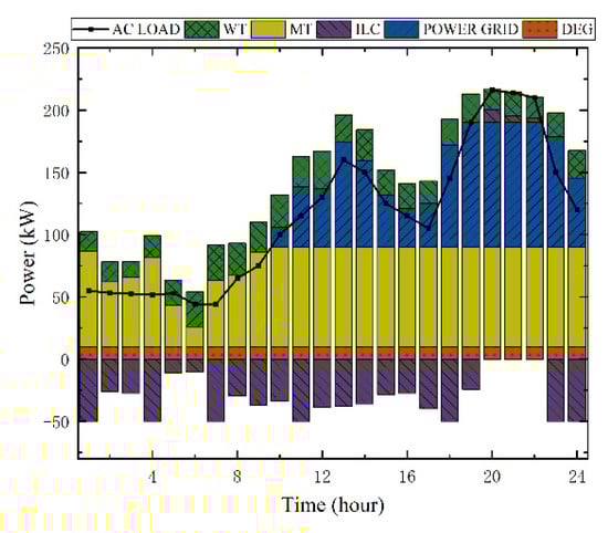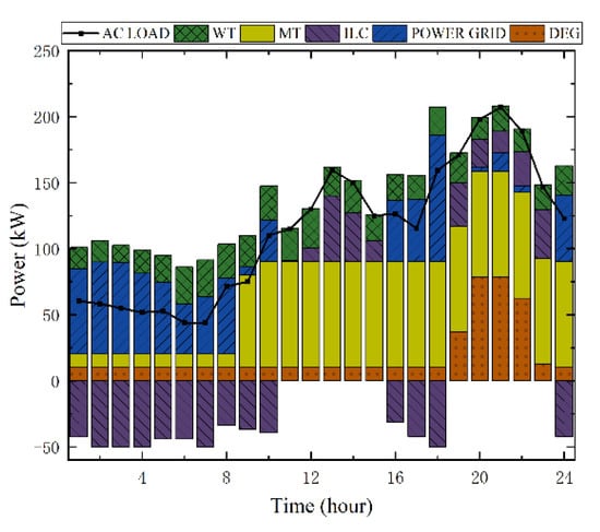 The power output of each DG of the AC and DC sub-microgrids is shown in Figure 8 and Figure 9, respectively. The wind power generation power is basically at a more average level within 24 h. The controllable microsources in the AC sub-microgrid include diesel generators and microcombustion turbines. The diesel generators are basically at their lowest power generation state due to their high-power generation cost and only play a backup role when the AC load is high (19:00~22:00). Microgas turbines, with their lower power generation costs, give full play to their power generation advantages during the hours when the gap between wind power and AC load is too large (9:00~24:00), thus meeting the demand, and the power generated by them in 24 h accounts for about 49.31% of the AC load. The AC sub-microgrid purchases power from the grid at a lower price during the valley load hours (24:00 to 08:00) and continues to purchase power from the grid during the peak load hours (16:00 to 18:00) to meet the load demand.