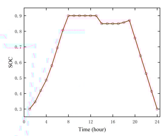 PV power generation increases and then decreases from 8:00 to 18:00. The controllable microsource in the DC sub-microgrid is the fuel cell. During the period from 9:00 to 24:00, the load demand starts to gradually increase, and the fuel cell output also starts to gradually increase, becoming the main source of electricity for the DC sub-microgrid. The power generated by it in 24 h accounts for about 64.15% of the DC load, and due to the emergence of PV, the fuel cell does not reach its maximum power at first. The battery is charged during the valley tariff and when the load level is not high (1:00 to 7:00) and discharged during the higher load hours (13:00, 19:00 to 23:00), if it meets the requirements of the charge state. Figure 10 shows the charge state of the battery as a function of time. The battery acts as an energy buffer link to complement other distributed energy sources, playing a role in peak and valley reduction while also increasing the flexibility of the system.