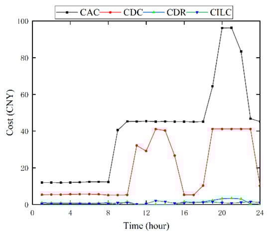 The AC sub-microgrid and the DC sub-microgrid exchange power through a bidirectional power converter. The figure shows the interactive power between the sub-microgrids, setting the input sub-microgrid as positive. Combining the two diagrams, it can be concluded that during the period from 1:00 to 7:00, the PV power is 0, the AC sub-microgrid delivers power to the DC sub-microgrid, and the DC sub-microgrid uses the resulting power to balance the load and charge the battery. During the period from 12:00 to 15:00, the PV output is larger, while the AC sub-microgrid experiences a peak load, and the DC sub-microgrid delivers power to the AC sub-microgrid to satisfy the power balance. During the hours of 19:00~23:00, the AC and DC loads come to the peak hours of the day, the battery starts to discharge under the premise of meeting the requirements of the charge state, and the DC sub-microgrid transmits power to the AC sub-microgrid due to the overload of the AC sub-microgrid. The time curve of each cost in the lower layer objective function is shown in Figure 11.