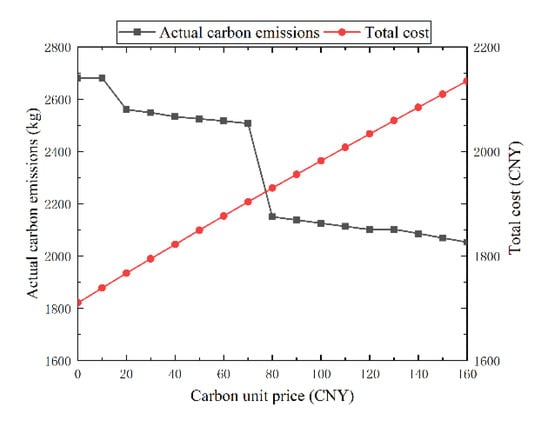 The carbon trading price can be regarded as the weight of the objective function, so the change of the carbon trading price will affect the carbon emission, carbon trading cost, and energy purchase cost and thus affect the total operating cost of the system. In order to further study the impact of carbon trading price on system operation, the relationship between total operating cost and actual carbon emissions with carbon price was drawn, as shown in Figure 16.