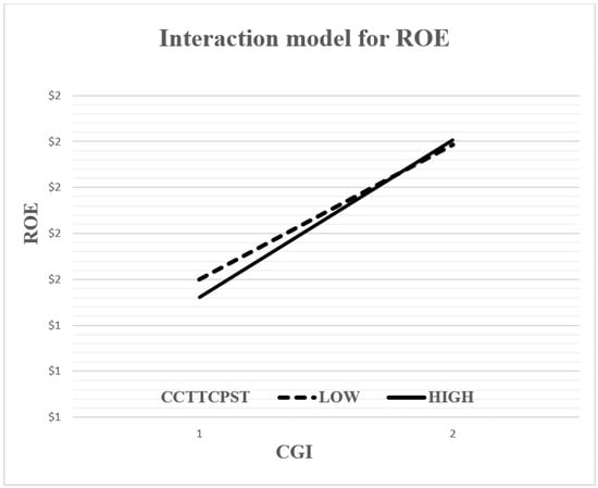 In order to gain further insights into the moderating effect, two-way interaction effects (simple regression slopes) [112] were plotted to confirm the presence of interaction as well as to facilitate the interpretation of conditional marginal effects [23,106]. Following the suggestion of [113], the sample was divided into two groups based on the mean value and standard deviation of the moderating variable (e.g., ±1 standard deviation from the mean of CS), and the respective interaction effects were examined by plotting the relationship between the CGI and performance indicators for both groups. Accordingly, both the figures (Figure 1 and Figure 2) offer further evidence that there is an interaction effect because the lines are not parallel [106], which is because the regression analysis of the performance indicators (ROA or ROE) and the CGI changes as a function of CS. Hence, these figures clarify the moderating effect of CS and show that, for low levels of CS, the positive relationship between the CGI and performance indicators (ROA or ROE) is more obvious compared to the slope attributed to high levels of CS which, although positive, is clearly less obvious. This means that when non-financial Jordanian firms have a lower level of CS, they perform better as compared to those with a higher level of CS. According to simple regression slopes, the optimal scenario occurs when the CS is at a low level and can capture higher performance when both accounting (operating)-based performance measures are applied to non-financial listed firms on the ASE rather than under a scenario involving a high CS. Thus, the main findings of this study are fully supported by graphical illustrations.