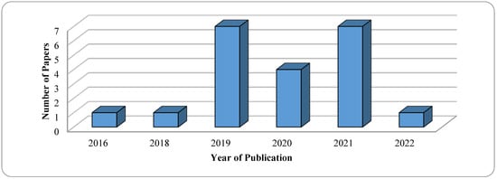 According to the data analyses performed using sample articles collected, RQ1 can be addressed on two fronts. The year of article publication and the relevance of articles on research questions do provide evidence of the extent to which research has been conducted in this niche. Figure 3 shows the distribution of the years in which articles addressing this subject were published. The time trend indicates that BCT is gaining increasing attention and interest in supply chain sustainability. The recency of the phenomenon necessitated data collection only within a restricted period between 2016 to March of 2022. The time trend clearly depicts a progression of research interest based on the number of publications. However, there is an inconsistency as seen in the chart, which indicates a decrease in the number of publications in 2020. This could be explained by several factors, including the unprecedented COVID 19 pandemic and a limited leverage of publication databases. Furthermore, Table 3 shows in part the distribution of articles based on the relevance to the research questions. RQ1 is clearly linked with eight research articles that highlight continued interest in this research area. In a recent study that proposed an analytical approach to assessing the impact of BCT on sustainable supply chain performance, ref. [33] compared their conceptual model to those of 10 recent studies, which displayed models in assessing supply chain performance and sustainability in mining supply chains. The capabilities of BCT for efficient supply chain management have become more pervasive in recent years [33]. Prospects of studies seeking trajectories to uncover capabilities of BCT in traceability across integrated functional areas have increased significantly. Ref. [34] for instance, aspires to extend the scope of an investigation of BCT in the iron and steel enterprises beyond the logistic chain. Integrating the financial chain, production chain and supply chain will provide better data resource leverage and make capital flow and information flow more secure and reliable [34]. Blockchain, with its unique characteristics, has received growing attention from engineers, researchers, and practitioners in the last decade [24]. There is no doubt that this research area will enjoy continued growth in both academic and practical application sectors.