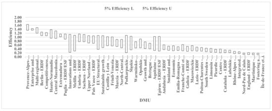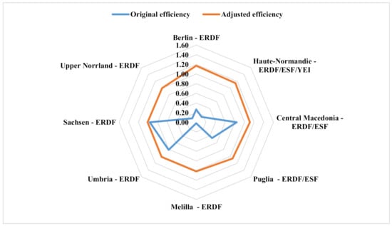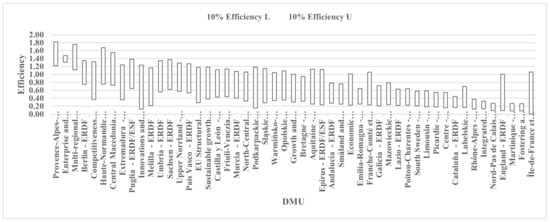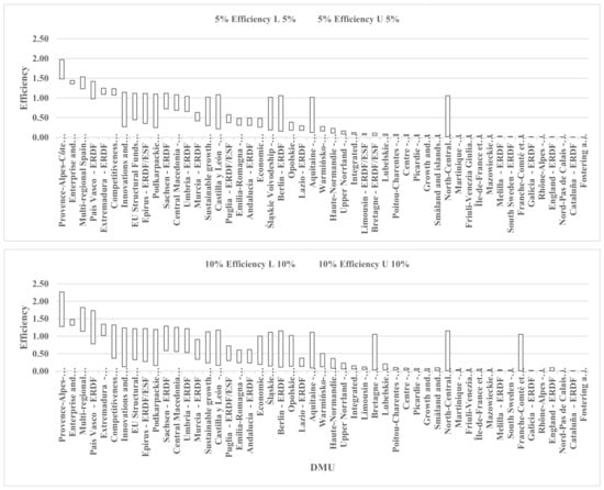 The robustness assessment reveals that “Enterprise and Innovation for Competitiveness—CZ—ERDF”, “Provence-Alpes-Côte d’Azur—ERDF/ESF/YEI”, “Multi-regional Spain—ERDF”, and “Extremadura—ERDF” are the OPs that keep their efficiency for data variations of 5% and 10%, regardless of accounting for any adjustments of the factors. Moreover, without any adjustments, 55% of the OPs are robustly inefficient; with adjustments, 37% of the OPs are robustly inefficient. In any case, these data indicate that the management practices of these OPs were the primary cause for such results.