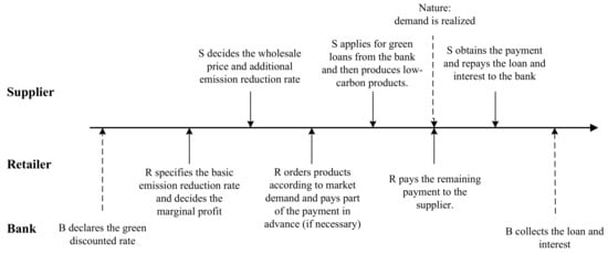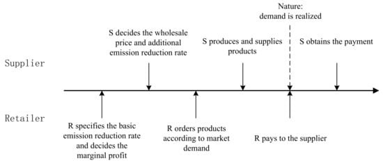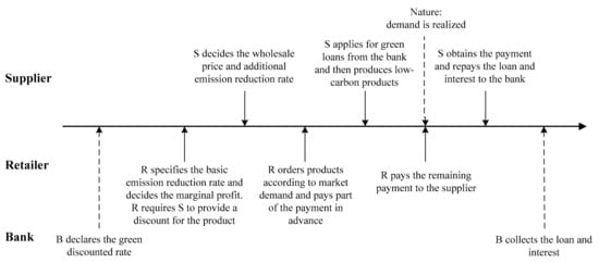First, we analyze the benchmark model that the supplier has sufficient funds to reduce carbon emissions. In this case, . The decision orders of the supply chain members are as follows (see Figure 1):