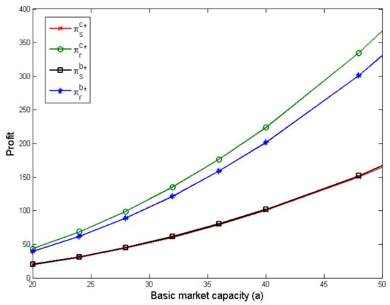 Proposition 2 (2) demonstrates that GCF at a discounted interest rate can improve the retailer’s marginal profit. However, as is shown in Proposition 2 (3), under discounted interest rate, the wholesale price and retail price will not always increase. When the basic market capacity is relatively low (), the discounted interest rate will not only decrease the wholesale price but also decrease the retail price. When the bank implements GCF at a discounted interest rate, considering a reduction in the supplier’s capital cost, the retailer will require a lower wholesale price. Due to the low market capacity, the retailer will lower prices to attract more consumers. In this case, under the GCF at a discounted interest rate, consumers can buy products with a higher emission reduction rate at a lower cost. When falls in the range of , due to the increase in market capacity, the retailer gradually increases the retail price. However, in this case, due to the weak position in the supply chain, the supplier will still be required to reduce the wholesale price. At this time, part of the supplier’s profit is squeezed by the retailer. When is relatively high (), implying that the market capacity is relatively large, both the supplier and the retailer will increase their selling price under the discounted interest rate. At this time, the retailer is willing to accept a higher wholesale price and transfer it to consumers through the retail price. In this case, consumers need to pay a higher price for green products.