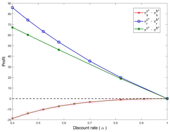 Proposition 3 (3) shows that the implementation of discounted interest rates is not always beneficial for the retailer. When is relatively low and satisfies , the retailer can gain more profits under a fixed interest rate. When falls in the range of , the discounted interest rate is profitable for the retailer. This result indicates that under discounted interest rates, the retailer is better off cooperating with the supplier who has difficulty in emission reduction. By contrast, under a fixed interest rate, the retailer should cooperate with the supplier who can reduce carbon emissions more easily.