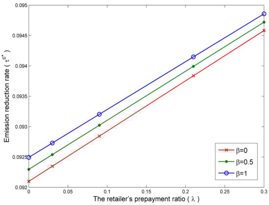 Proposition 2 (1) indicates that, compared with the fixed interest rate, the discounted interest rate can encourage the supplier to improve its emission reduction rate. Under the discounted interest rate, the supplier’s loan interest is lower. Thus, the supplier is willing to invest more in emission reduction through GCF. In order to improve the emission reduction rate of a capital-constrained supplier, it is necessary to implement credit incentives related to the emission reduction rate.